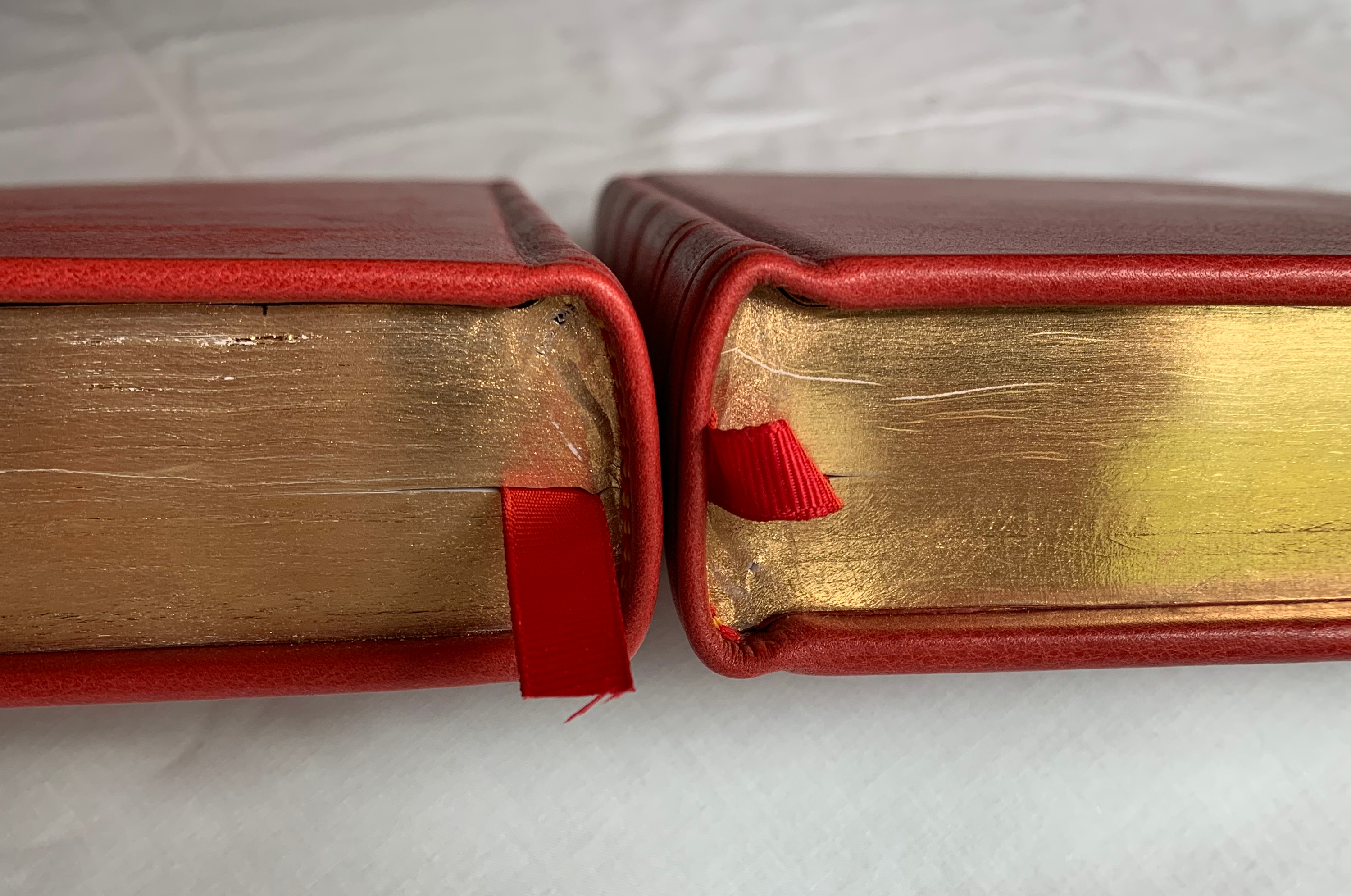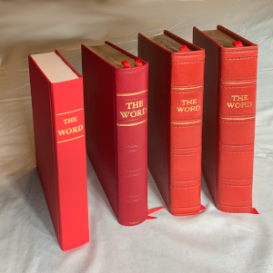 The cover is red calfskin. The spine is stamped with "The Word" in real gold. The page edges are gilded, and the page corners are square.