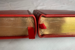 The page edges are gilded, and the page corners are square. This binder does hand stitching of the spine. The volumes have some variation: a few have a different color end-pages, a few have brass corners on the covers, some have a slightly thinner cover.