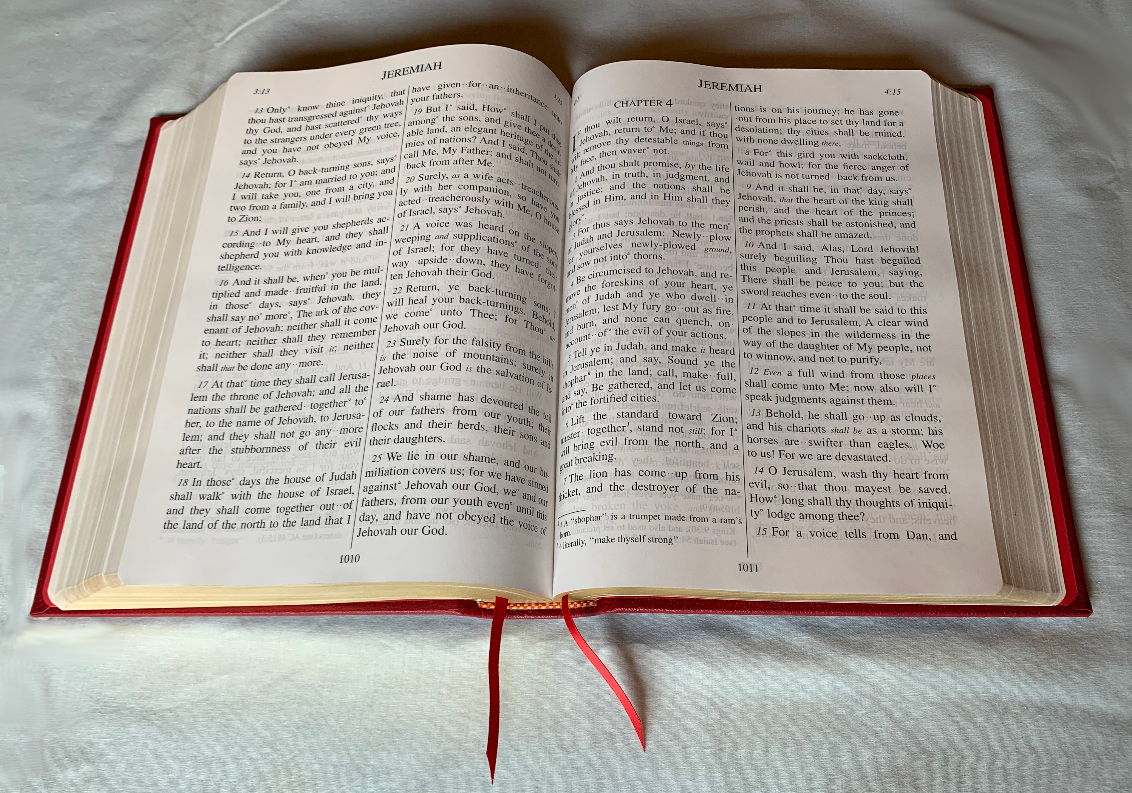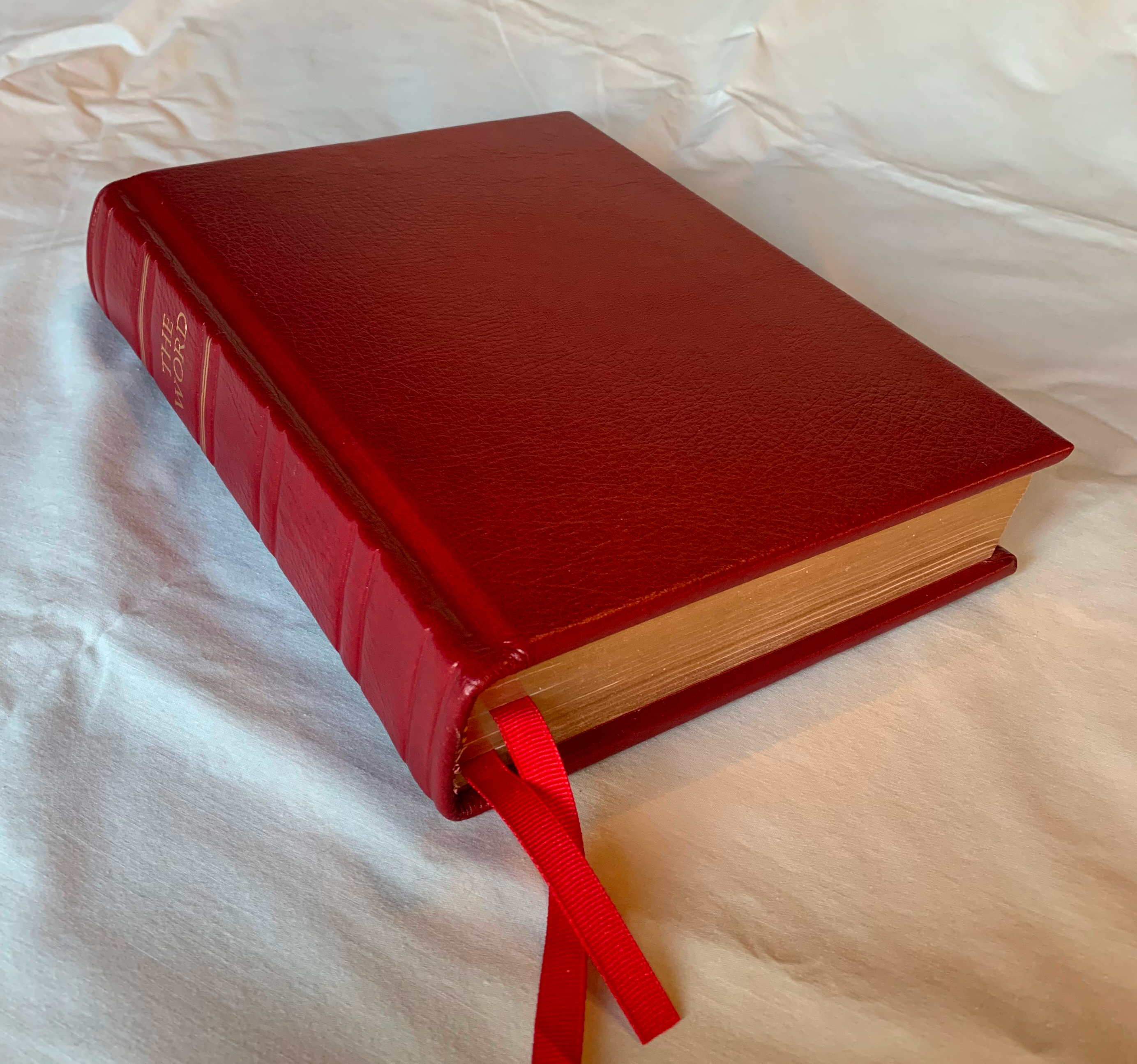 The cover is red calfskin. The spine is stamped with "The Word" in real gold. The page edges are gilded, and the page corners are rounded.